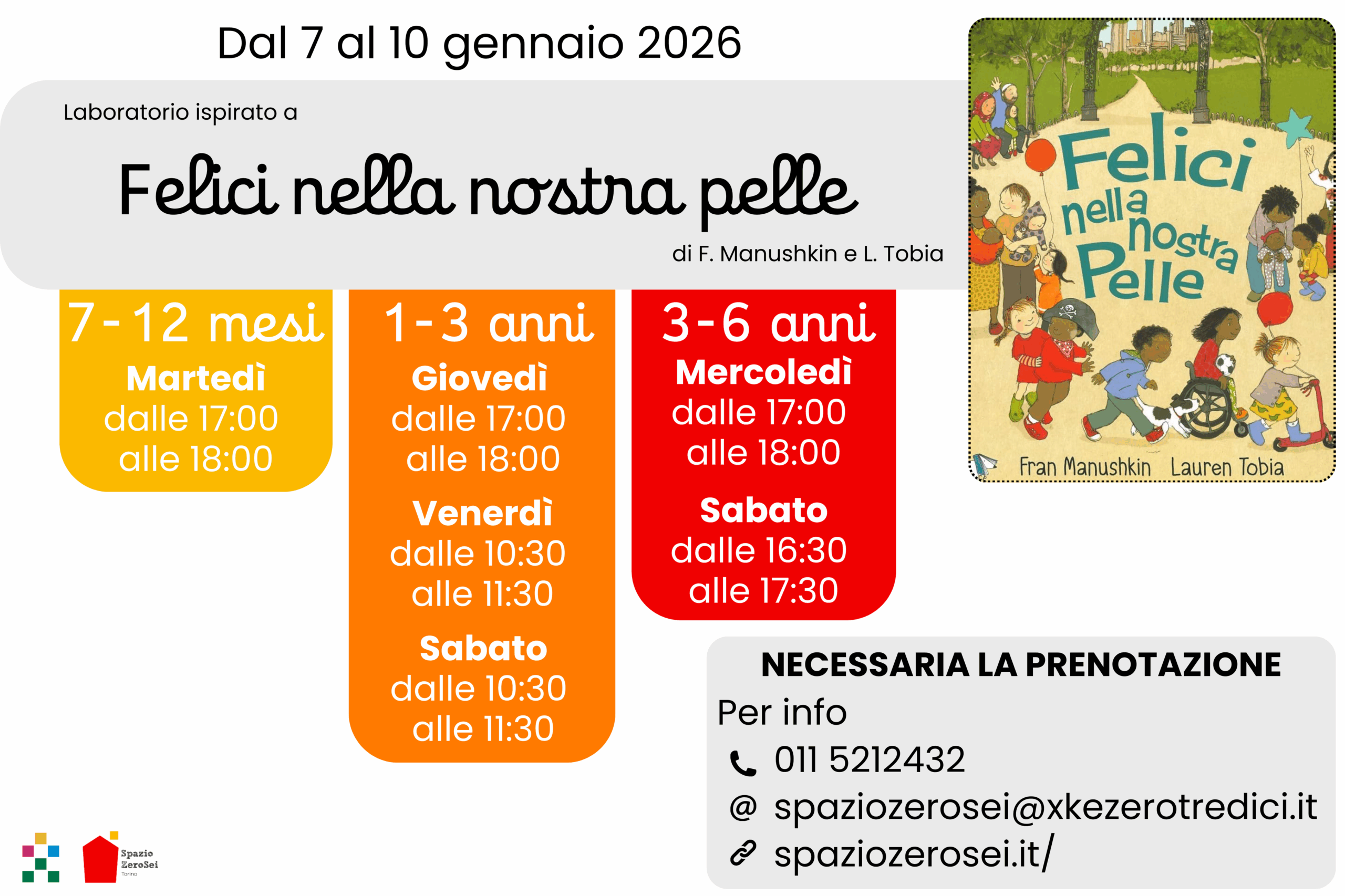 Dal 7 al 10 gennaio 2026 – Attività ispirata a “Felici nella nostra pelle” di F. Manushkin e L. Tobia – Per piccoli gruppi di adulti e bambini.